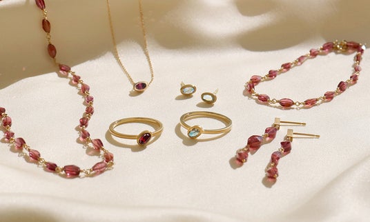 クリスマスコレクション左から ・luxe Essenceネックレスロードライトガーネット¥44,000(税込) ・Aromaリングロードライトガーネット¥126,500(税込) ・Aromaネックレスロードライトガーネット¥115,500(税込) ・Aromaリングアンデシンラブラドライト¥132000(税込) ・Aromaピアスアンデシンラブラドライト¥115,500(税込) ・luxe Essenceブレスレットロードライトガーネット¥28,600(税込) ・luxe Essenceショートピアスロードライトガーネット¥28,600(税込)