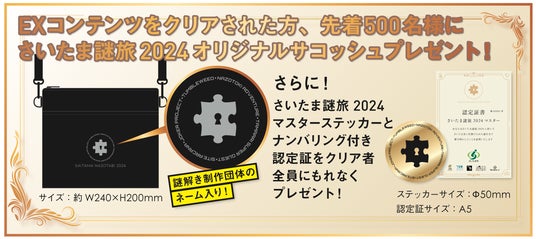 また、エクストラコンテンツをクリアすると、先着500名様に「さいたま謎旅2024オリジナルサコッシュ」をプレゼント。さらに、「さいたま謎旅2024マスターステッカー」「さいたま謎旅マスター認定証」をもれなくプレゼントいたします。