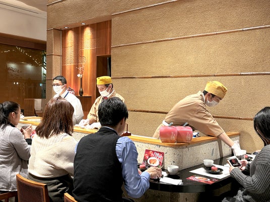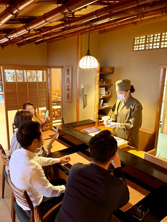本店に続き、東京日本橋 コレド室町3にございます鶴屋吉信 TOKYOMISE(東京店)でもご試食会を開催いたしました。賑やかな街並みの中、大きな建物の1階部分にある東京店は、この春店舗を一部リニューアルした注目の店舗。お店の中心部分に、本店以外では唯一となる「菓遊茶屋」を設置しており、こちらのカウンターでのおもてなしとなりました。