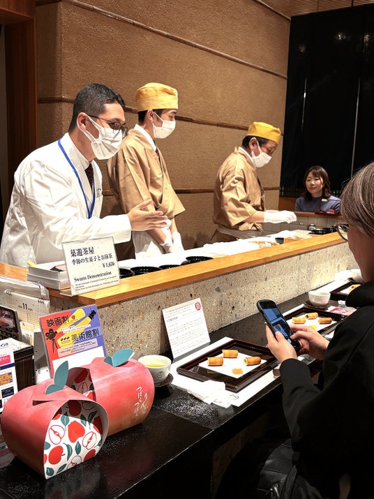 ふだんは一人で担当させていただく和菓子職人も、この日は二人体制で生菓子実演をご披露。本店同様、目の前でお菓子がつくられていくライブ感をお楽しみいただきました。