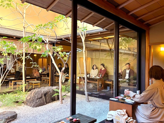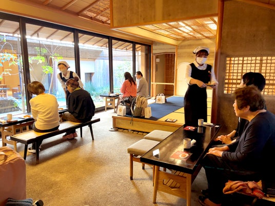 京都本店では秋晴れのはれやかなお天気の中、合計40名のお客様がご来店くださいました。早速、本店2階の茶寮「お休み処」のテーブル席にて、「ミニつばらつばら」「りんごの生菓子」をご提供。こちらの茶寮は店舗の2階にありながらも、美しい茶庭と吹き抜けをそなえた開放的な空間となっており、この日もゆったりとした時間が流れておりました。