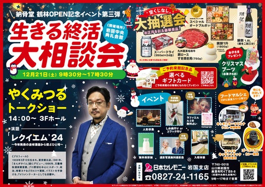10月に岩国中央典礼会館内にオープンした「清照寺 岩国納骨堂『鶴林(かくりん)』」への反響にお応えして12月21日(土)に「生きる終活大相談会」を開催。今回は、やくみつるさんによるトークショーを実施。他にも、空くじ無しの大抽選会、フードマルシェ、入棺体験や遺影写真撮影会など、色々なイベント盛り沢山!ぜひご家族みんなで遊びに来てください。