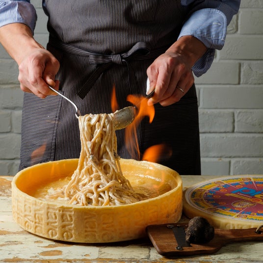 Cheese Tavern CASCINAの炎のチーズパスタはワンオーダーずつお客様の目の前で仕上げを行う料理です。