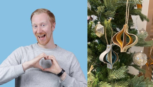 左)ノルウェー出身のコメディアン ミスターヤバタンさん 右)ストレスレス(R)端切れで作るクリスマスオーナメント