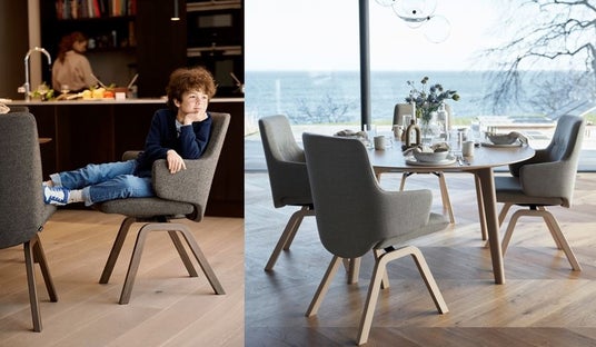 ●ストレスレス(R)ダイニングシリーズ/リクライニング機能付でホールド感あるバッククッションと長時間座っても疲れにくい密度の高いモールドウレタンを使用したクッションが人気。北欧らしいシンプルで美しいデザインのラウンドテーブルも。