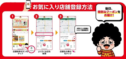 ご利用予定の当社店舗をお気に入り登録していただくと、後日、期間限定のおすすめメニューを100円(税込)でお試しできるクーポンを配信いたします。