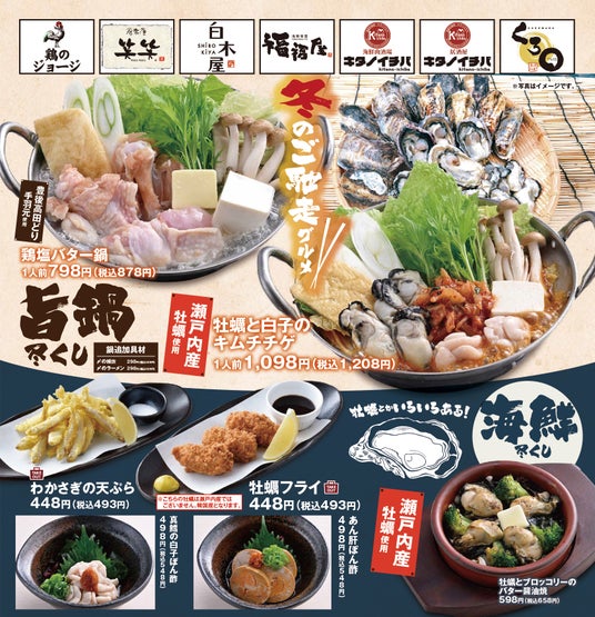 株式会社モンテローザ(本社:東京都杉並区 代表取締役:大神輝博)は、「海鮮肉酒場 キタノイチバ」「居酒屋 キタノイチバ」で季節限定メニューの販売を開始します。瀬戸内産の”牡蠣”を使用した『牡蠣と白子のキムチチゲ』をはじめ、『鶏塩バター鍋』『牡蠣とブロッコリーのバター醤油焼』『真鱈の白子ぽん酢』など、冬の味覚を存分に味わえるメニューをラインナップしました。
