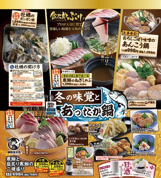 【冬の味覚とあったか鍋】牡蠣、寒鰤、あんこう、白子など 季節のおすすめメニュー【目利きの銀次・横濱魚萬・北海道魚萬】