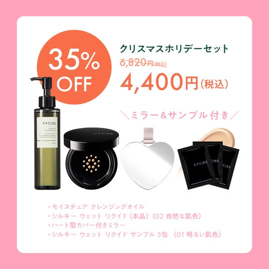 100%植物性オイル「モイスチュア クレンジングオイル」、さらに旅行やお出かけなどにぴったりな、 ハート型カバー付きミラー&シルキー ウェット リクイド〈01 明るい肌色〉のサンプルがついた豪華なセットです。自分へのご褒美にもおすすめ!冬にぴったりなセットです。