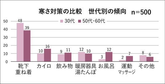 また、冷え対策に関しては世代ごとに異なる傾向があり、30代の女性は靴下の重ね履きやカイロといった手軽な対策を好む一方、50代・60代の女性は湯船に浸かるなど、全身を温める方法を選ぶ傾向が強いことがわかりました。