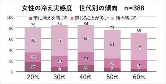 当社が実施したアンケート調査によると、20代から60代の女性500名のうち、冷えを「常に感じる」または「感じることが多い」と回答した388名(約8割)を分析した結果、冷えを日常的に感じている人が多数を占めることがわかりました。特に、30代・40代では冷えを感じる頻度が高い傾向が見られます。