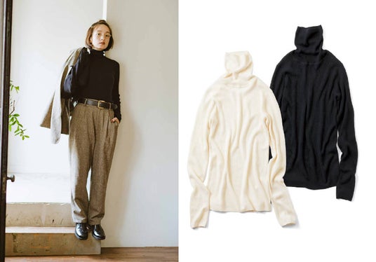 「顔の見えるカシミヤ」を使用した、素肌の一枚目に着たくなる極上の肌心地のタートルニットです。ゆるく編み立てた繊細なリブが伸びやかにフィットします。プレーンな身ごろに対して衿ぐりや袖口、すその編地に変化がある、シンプルながらさり気なく個性が光る一枚です。高めのタートルネックが首もとを包んで暖かく過ごせます。