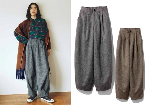 バルーン調のワイド感で体形をカバーできるバナナシルエットパンツです。ウエストのタックでボリュームを出し、裾をダーツで絞ったシルエットでこなれ感をプラスします。ウエスト後ろのゴムは快適なはき心地です。シンプルなトップスと合わせるだけで主役級の存在感です。
