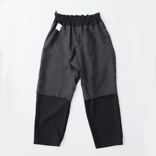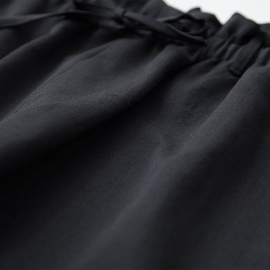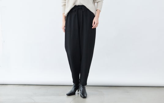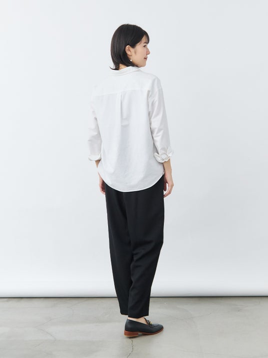 腰回りから膝にかけてたっぷりと生地を使ってゆとりを持たせ、裾に向かってすっきりと収まる”テーパード”シルエットになっています。
