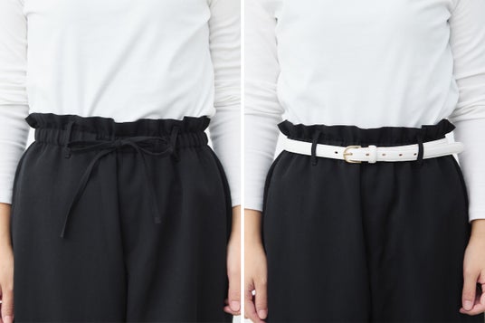紐をしまってベルトをつけると、一気にきちんとした印象に。