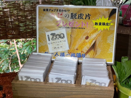 ヘビの脱皮片は財布に入れておくと金運がアップすると言われています。iZooでは来場者の方へ、ヘビの脱皮片を毎日数量限定でプレゼントしています。中にはニシキヘビやコブラなどの脱皮片も。