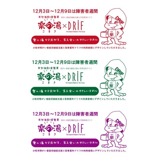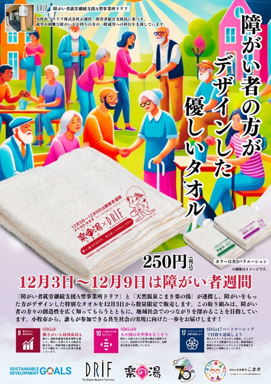 障がい者週間を記念し、障がい者の方がデザインした特別タオルを数量限定で販売します。地域と共に歩む「こまき楽の湯」が贈る、誰もが参加できる共生社会を目指す心温まるプロジェクトです!