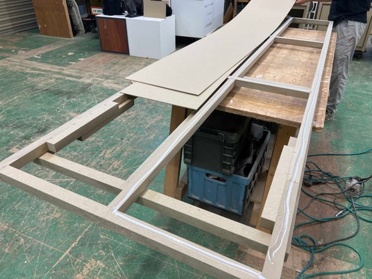 再生板紙構法は、木工ブースとほぼ同じ考え方でブース形状をつくる。