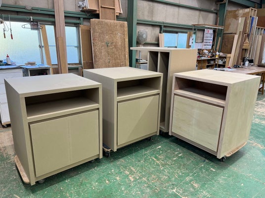 右端は木工による展示台。左の2台は再生板紙による展示台。見た目はほぼ分からない。本展示台はエコプロ会場にて設置する(再生板紙による展示台のうち1台は壁紙を貼る)