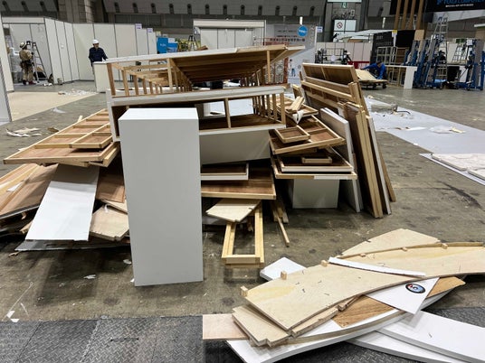 展示会終了後、木工ブースに用いた木材のほとんどは廃棄されてしまう。毎週のように開催される展示会において、その数量は膨大なものとなる。これは、展示会業界全体の中で考えていくべき課題と言える。