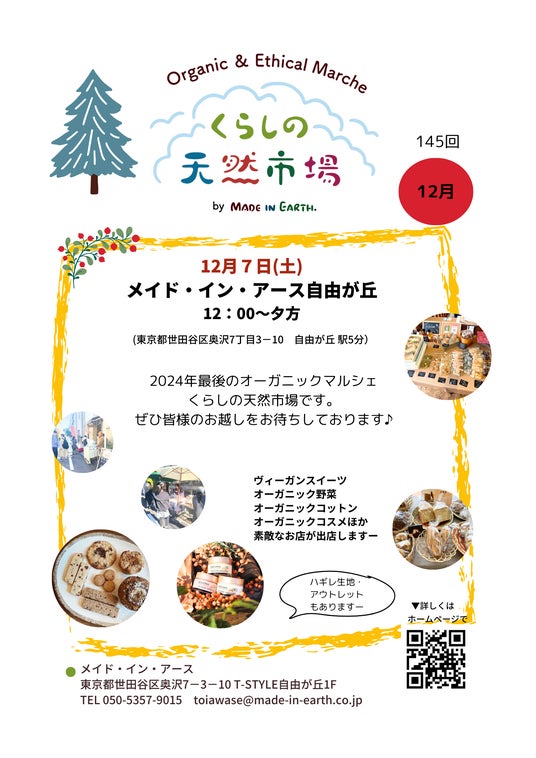 [美味しい・安心オーガニックを!] 第145回オーガニックマルシェ「くらしの天然市場」12/7(土) 開催!有機野菜・天然酵母パン・オーガニックスイーツ・有機茶・オーガニックコットンやコスメが集結!