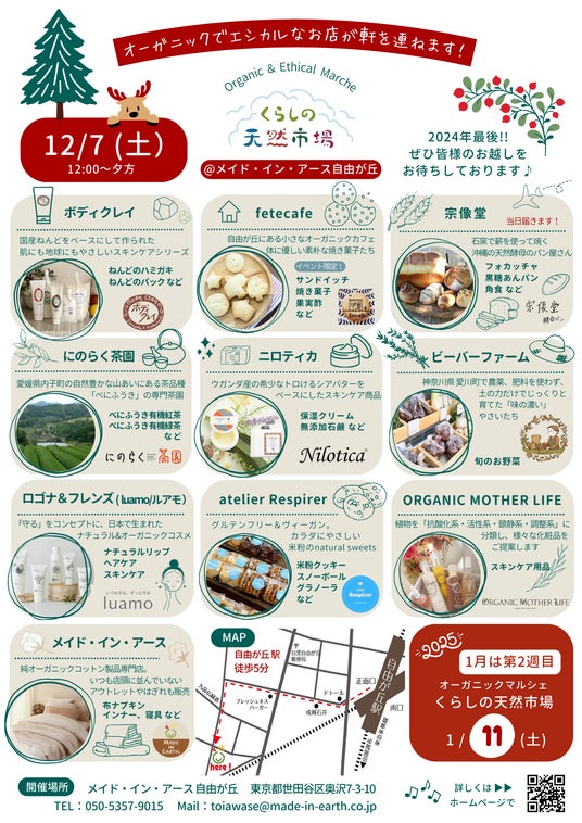 🌿 オーガニックコットンメーカー主催の「オーガニックマルシェ」も、おかげさまで145回目を迎えます!12月7日、こだわりのオーガニック商品が集まる特別な一日を一緒に楽しみませんか?