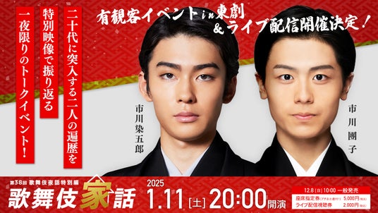 歌舞伎界の若き才能として注目を集め、2024年も目覚ましい活躍ぶりを見せた市川染五郎と市川團子。幼き頃から切磋琢磨してきた二人もいよいよ二十代に突入するこの節目に、これまでの共演の歴史を集めた“特別映像”とともに二人の成長を振り返る、一夜限りのスペシャルイベントとなります。お互いの成長ぶりをみた二人は何を語るのか!?イベントの模様は生配信でもお楽しみいただけます。新年の幕開きとともに、これからの飛躍により一層期待がかかる二人の二十代の門出をぜひ会場と配信でお祝いしましょう!