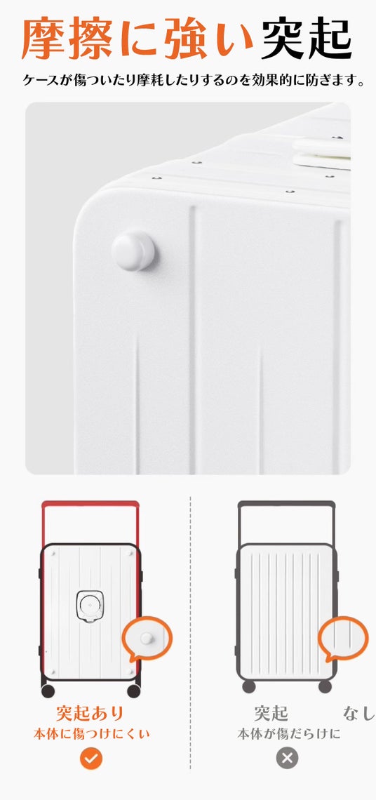 この突起によって、スーツケース表面が直接地面に接触しないため、スーツケース表面を傷つけず、キレイな状態を保つことができます。