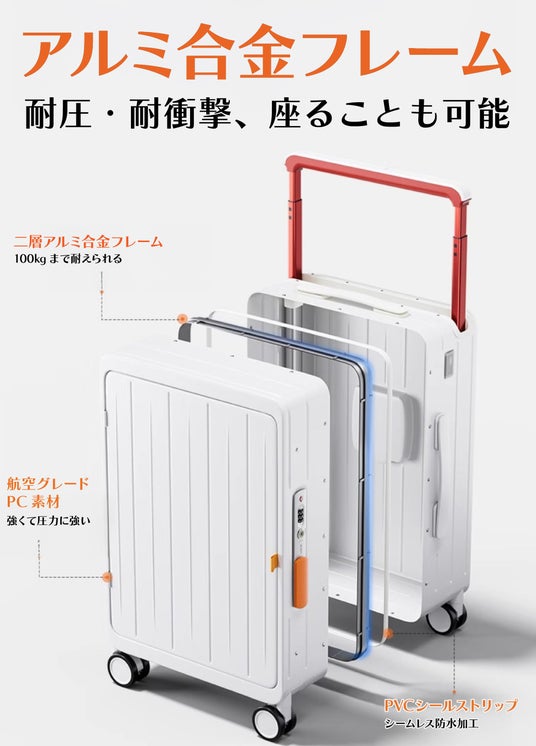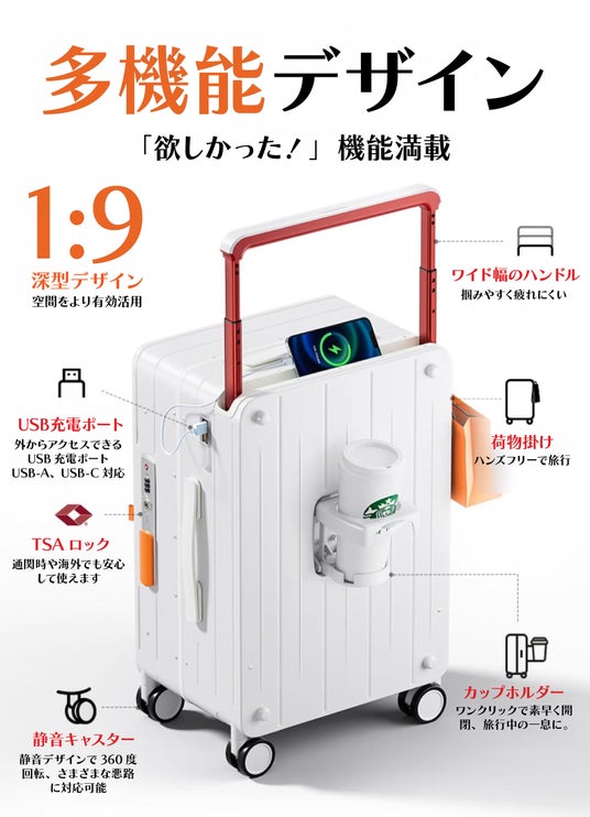 【TSAロック/USB-A・USB-C充電ポート/大容量45L/便利な荷物掛け・カップホルダー/頑丈なアルミ合金フレームと3層PC素材】
