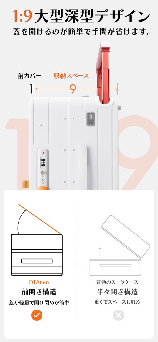 DTAneoは今までのスーツケースの常識を覆した画期的な構造。荷物の取り出しがより便利になります。