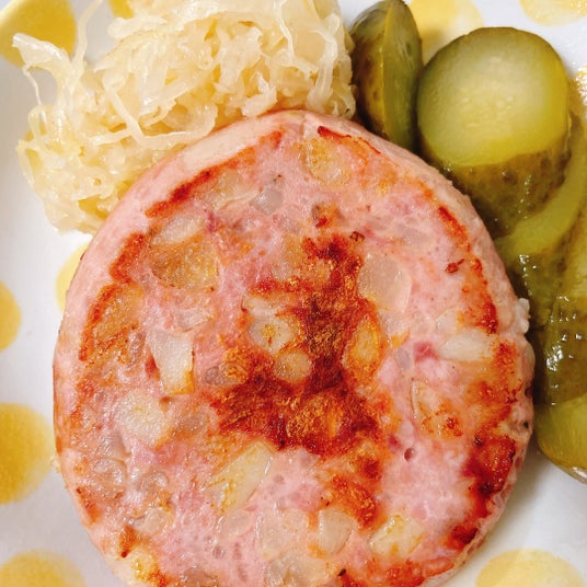 焼いたザウマーゲン。付け合わせは定番のザワークラウトとピクルス。