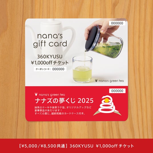 nana's green tea 2025年福袋 ¥5,000セット / ¥8,500セットに入っている「360KYUSU ¥1,000offチケット」のおもて面に記載されている番号を使用して、抽選を行います。