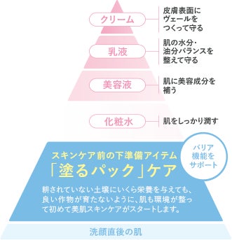 洗顔後のファーストステップとして洗い流すパックケアを行うことで、古い角質や汚れをやさしく落とし、水分と油分のバランスを整え、その後のスキンケアがより効果的になると考えています。