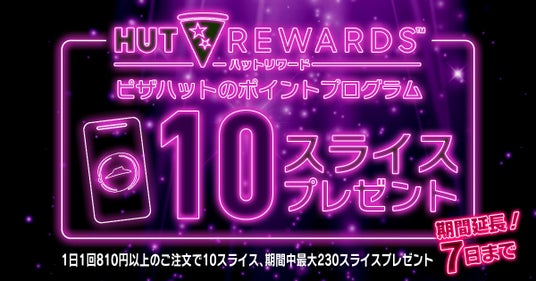 「ピザハット・ブラックフライデー スーパーセール」の特別延長を受け、ピザハットのメンバーシッププログラム「HUT REWARDS(ハットリワード)」でのポイントである「スライス」を会員様へ10スライスプレゼントするキャンペーンも2024年11月15日(金)~12月7日(土)と期間を延長いたします!