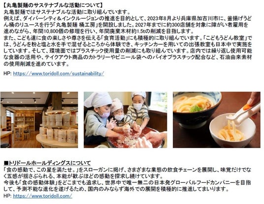 「ここのうどんは、生きている。」をブランドメッセージに掲げ、日々、食の感動体験を追求し手づくりの「おいしいうどん」をお客さまに提供しています。私たちは一軒一軒が製麺所であり、徹底的に鮮度にこだわり、国内800を超えるすべての店で、手間を惜しまず粉からうどんを日々つくり続けています。