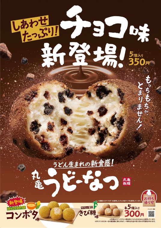 この冬は、『丸亀うどーなつ チョコ味』、『丸亀うどーなつ コンポタ味』の2種類が新しく登場します。『丸亀うどーなつ チョコ味』は、生地にもチョコレート味のチップやココアビスケットが練り込まれた、今だけの濃厚でリッチな味わい。『丸亀うどーなつ コンポタ味』は、もっちもち食感のうどーなつによく合う、コーンポタージュのクリーミーなまろやかさが特徴。冬にぴったりな、どこかほっこりする味わいです。