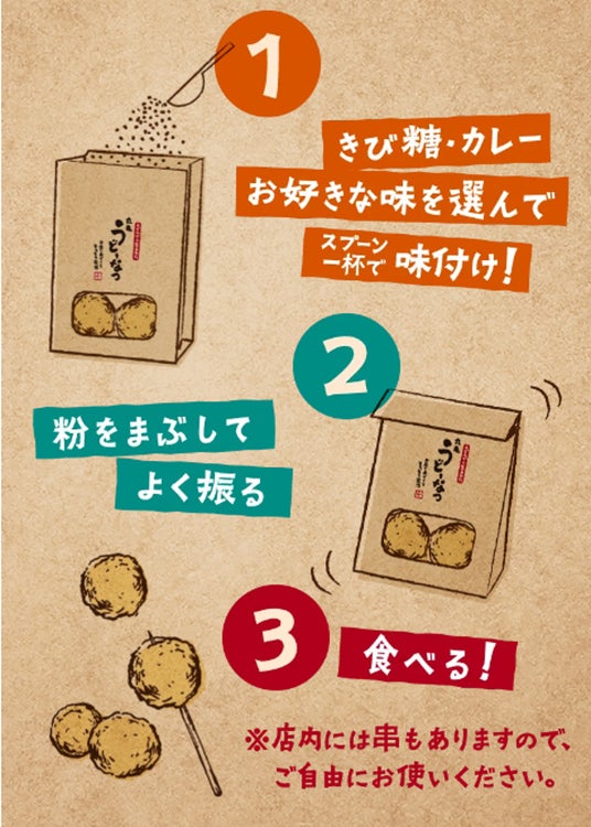 店頭で袋に入って販売している「丸亀うどーなつ」は素朴なプレーン味と、チョコレート味のチップとココアビスケットが練り込まれた「チョコ味」です。プレーン味には、店内にご用意しているコンポタパウダー、きび糖パウダーの中からお好きな味をスプーンに1杯とり「丸亀うどーなつ」の袋の中へ入れたら、よく振ってお召し上がりください。チョコ味には特製チョコレート味パウダーを入れてお召し上がりください。店内には、串のご用意もありますので、ご自由にお使いください。