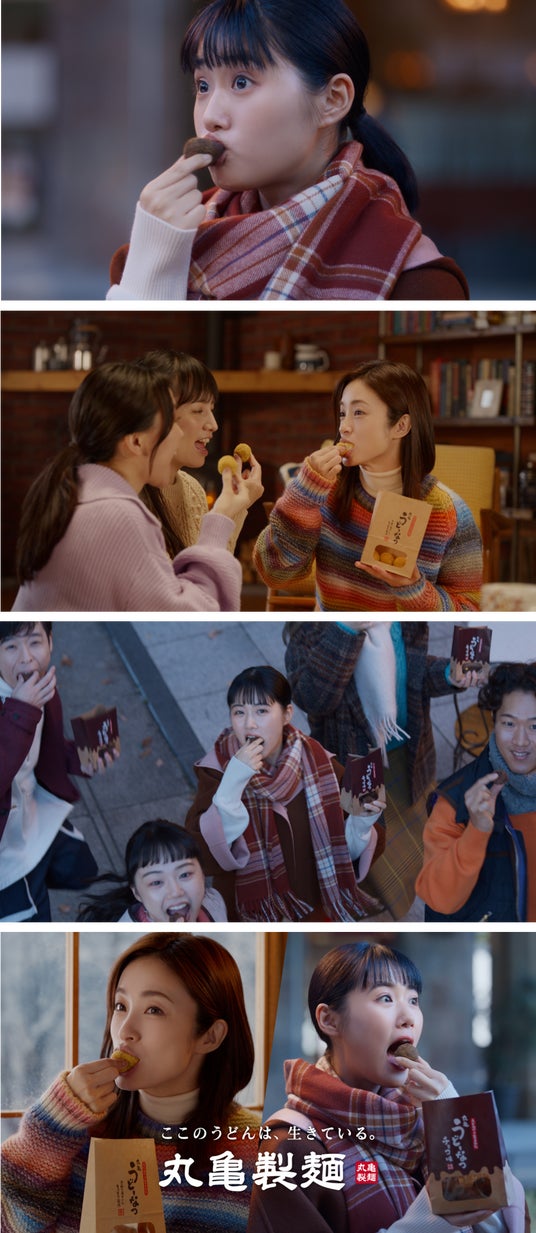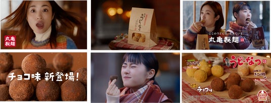 新TVCM 丸亀製麺「事件です!待望のチョコ味新登場!丸亀うどーなつ」篇では、12月3日(火)から全国の丸亀製麺にて販売開始となる、うどん生まれの「丸亀うどーなつ」の新味「チョコ味」と「コンポタ味」を、俳優の上戸 彩さんと原 菜乃華さんが幸せそうに頬張る姿をお届けします。この度登場する新作2種の味わいに、ほっこり幸せそうに楽しむお二人の表情にご注目ください。