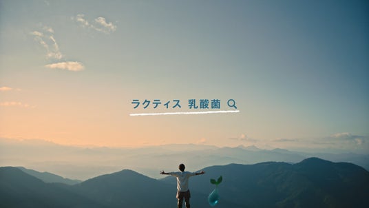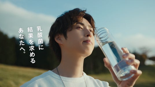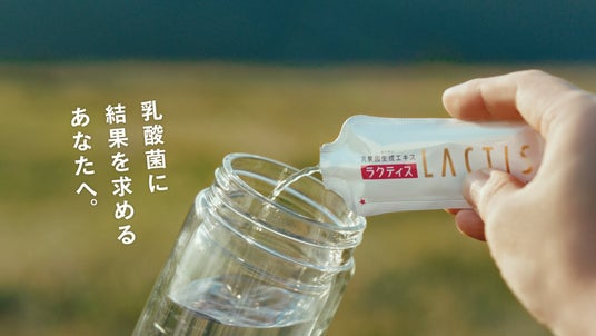驚きの表情を見せるYORIさんと得意気な顔をする〔ととのん〕。『乳酸菌に結果を求めるあなたへ。』というフレーズのもと、「ラクティス」を水に入れて飲み、2人は気持ちよさそうに伸びをして、CMは幕を閉じます。
