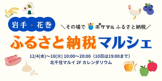 返礼品の生産者と寄附者が直接つながる国内初のふるさと納税サービス「ポケマルふるさと納税」を運営する株式会社雨風太陽(本社:岩手県花巻市、代表取締役:高橋 博之、証券コード:5616、以下「当社」)は、北千住マルイ2Fカレンダリウムにて「その場でポケマルふるさと納税 岩手・花巻ふるさと納税マルシェ」を 2024年12月4日(水)~10日(火)の期間で開催します。岩手県花巻市の特産品を実際に見ながらふるさと納税ができ、返礼品はすぐに持ち帰ることが可能です。また、期間中にはエポスカードでポケマルふるさと納税をすると、EPOSポイント還元率が10倍になるキャンペーンも実施します。