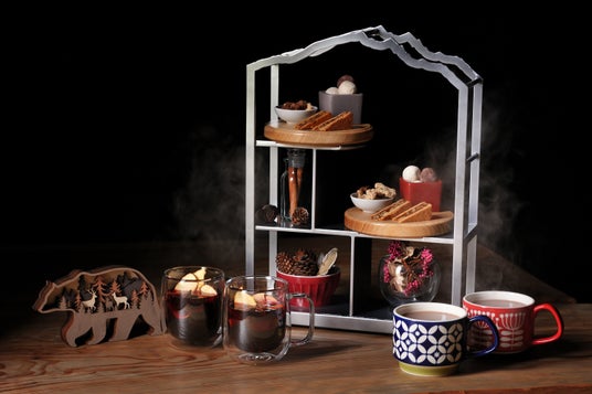 下りのロープウェイでは、スイスの伝統菓子エンガディナー(ヌガーをからめたくるみをクッキー生地で包み込んだお菓子)に着想を得たスイーツや、スイスで冬に親しまれているくるみやチョコレートを使ったスイーツを提供します。スイーツのお供に、グリューワインやホットチョコレートといった温かいドリンクもおすすめです。スイーツを盛付ける、谷川岳の稜線をかたどった特製スタンドは写真映え間違いなし。雪山を眺めながら心ゆくまで何周でもゴンドラの空中遊覧を楽しめます。