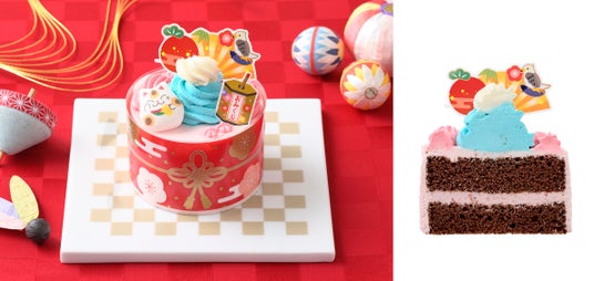 特長:2025年の「スイーツ初め(R)」にぴったり!招き猫、富士山、初日の出など、縁起のいいお正月モチーフをぎゅっと詰め込んだケーキです。苺クリームをサンドしたふわふわのココアスポンジの上に、レモンクリームで富士山を表現しました。おみくじピックの足部分には「大吉・中吉・小吉」のおみくじが付いています。