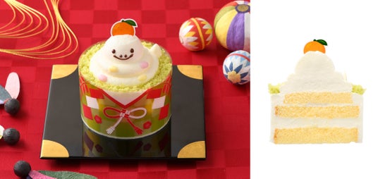 毎年人気の「スイーツおせち」2種類は、お正月の縁起の良いモチーフをプチケーキで表現し、専用ボックスに詰め合わせました。 「巳年のケーキ(鏡餅風)」は、スポンジのふんわり食感と2種類のクリームの風味を楽しめるケーキ。 「おみくじ付き初夢ケーキ」は、招き猫や富士山のモチーフがにぎやかで、おみくじが付いたピックで運だめしもできます。