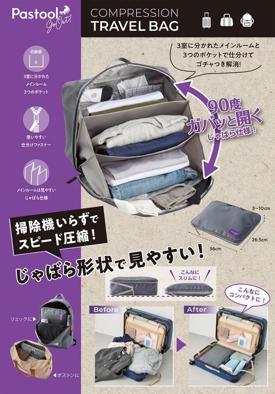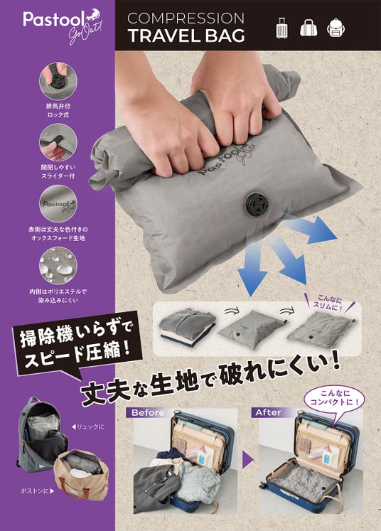 株式会社コジット(本社:大阪府大阪市、代表取締役:久保慎一郎)は、旅行に便利な掃除機いらずの圧縮収納グッズ「Pastool go outトラベル衣類圧縮袋 M 2枚組 」「Pastool go outトラベル衣類圧縮袋 L 2枚組 」「Pastool go outトラベルじゃばら圧縮ポーチ」を2024年12月2日(月)より全国発売します。