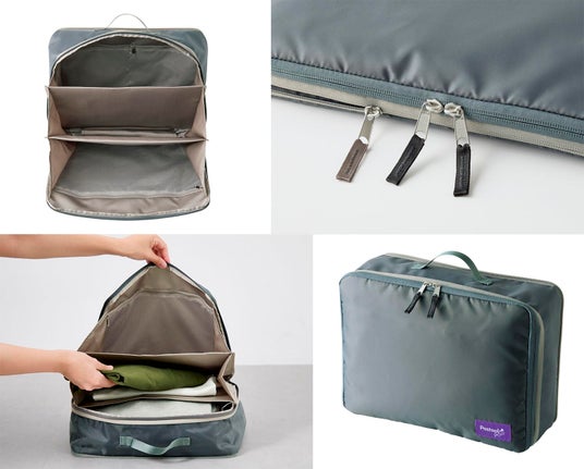90度ガバッと開くじゃばら仕様で見やすく、用途ごとに仕分けられて便利な圧縮ポーチ。スーツケースの中もすっきりコンパクトに。