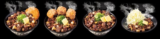 左から『メンチ合盛り乱切り赤身牛コンボ丼』『唐揚げ合盛り乱切り赤身牛コンボ丼』『肉2倍盛り乱切り赤身牛コンボ丼』『乱切り赤身牛コンボ定食』
