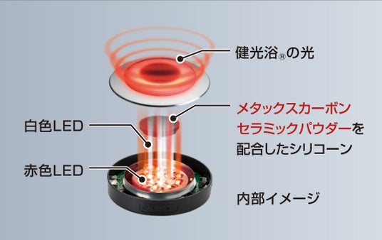 独自素材のメタックスカーボンセラミックを配合したシリコーンや樹脂などに光をあてることで放射される光のこと。医療の現場やアスリートのケアにも使用されており、照射部位の筋肉をほぐしリラックスさせる効果が期待できます。