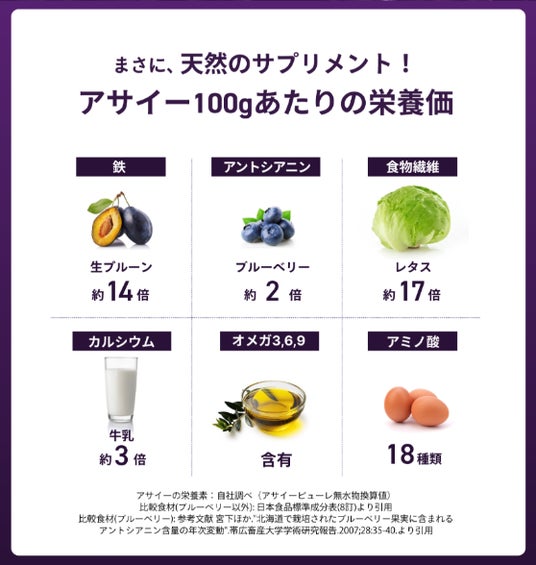 アサイーは特に鉄分、アントシアニン(ポリフェノールの一種である色素)、食物繊維、カルシウム、オメガ脂肪酸、アミノ酸などが特徴的であり、とりわけ鉄分の積極的な摂取が望ましい方をサポートするフルーツです。