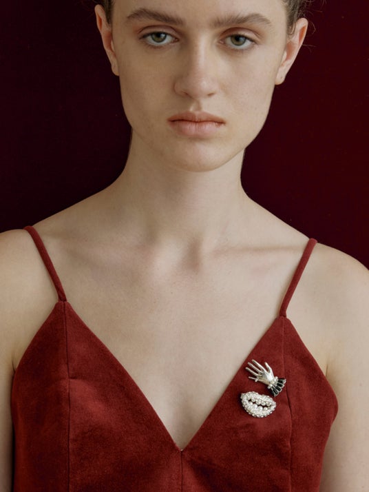 思わず笑顔になるユーモラスな目と唇モチーフに繊細なストーンを詰め込んだブローチ