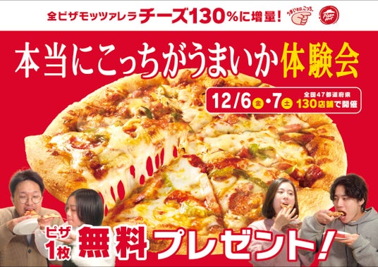 判定会の結果を踏まえて、さらに多くの方にモッツァレラチーズ量を130%に増量した「うまさの黄金比」を体験いただくため、12月6日(金)・7日(土)の2日間、全国47都道府県130店舗にて「AIピザ」(デラックス Mサイズ)を無料で提供するキャンペーン「本当にこっちがうまいか体験会」を実施いたします。